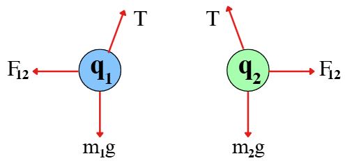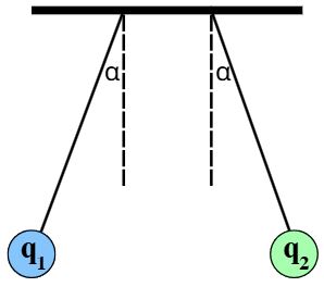 שני כדורי מתכת קטנים תלויים על 2 חוטים. כדור 1 בעל מסה m₁ = 5g ומטען q₁ = -8·10⁻⁶c. כדור 2 בעל מסה m₂ = 5g ומטען q₂ לא ידוע. הכדורים מגיעים לשיווי משקל ונמצאים באותו הגובה כאשר כל חוט יוצר זווית α = 20° עם האנך.