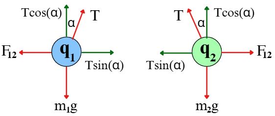 m₁ = m₂ = 5g = 5·10⁻³kg, q₁ = -8·10⁻⁶c, α = 20°