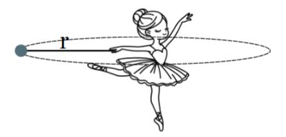 רקדנית סיבוב מחזיקה משקולת בקצה חוט באורך r = 0.75m וגורמת לה לנוע במסלול מעגלי אופקי. תדירות הסיבוב של המשקולת היא f = 2Hz.